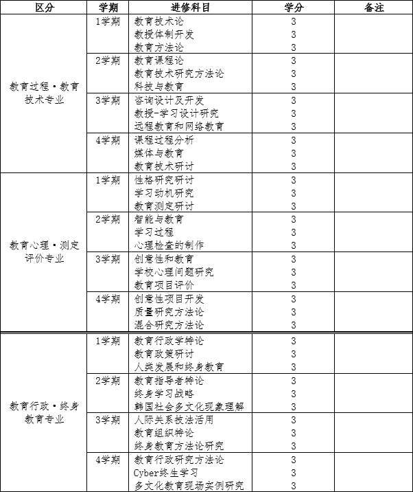 - 博士课程:毕业于特殊研究生院及非教育专业者,须在以下选修科目中修满9学分以上。 - 选修科目有:终身教育论、教学设计、学校心理学、教育者领导能力、学校文化探索、教育研究方法。