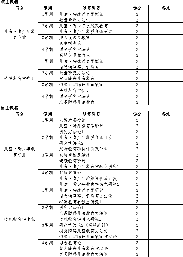 - 报考本博士课程时,如不是儿童(幼儿) 教育、家庭(教育)学、特殊教育、儿童(幼儿) 特殊教育、教育学、儿童学(儿童家庭学), 青少年学、心理学及其他相关专业硕士学位持有者,需要完成本研究生院硕士课程共同科目的儿童特殊教育及概论和研究方法(数量或质量研究方法论中的一门) 。