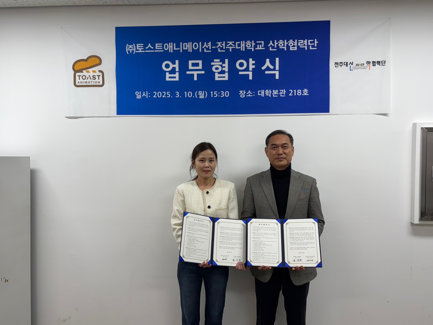 ㈜토스트애니메이션은 전북 유일의 애니메이션 전문 업체로 스토리텔러와 디자인 전문가로 구성돼 캐릭터 개발, 3D 애니메이션, 브랜딩을 지원하고 있으며, 단순히 콘텐츠를 개발하는 걸 넘어서 유익하고 따뜻한 가치를 추구함으로써 전주대학교와 심리치료 콘텐츠 개발 및 스마트 인형 개발 등을 위한 긴밀한 협력이 예상된다.