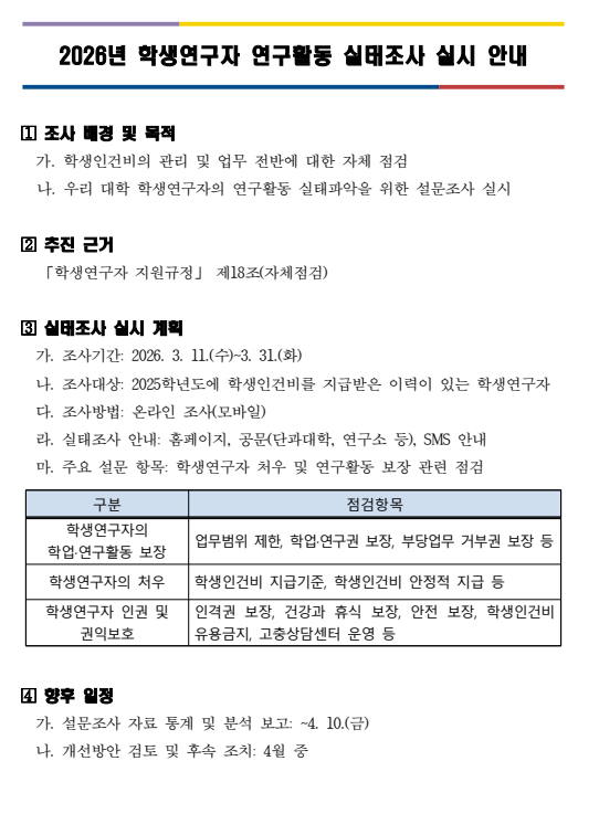 2026년 학생연구자 연구활동 실태조사 실시 안내(~2026. 3. 31.)